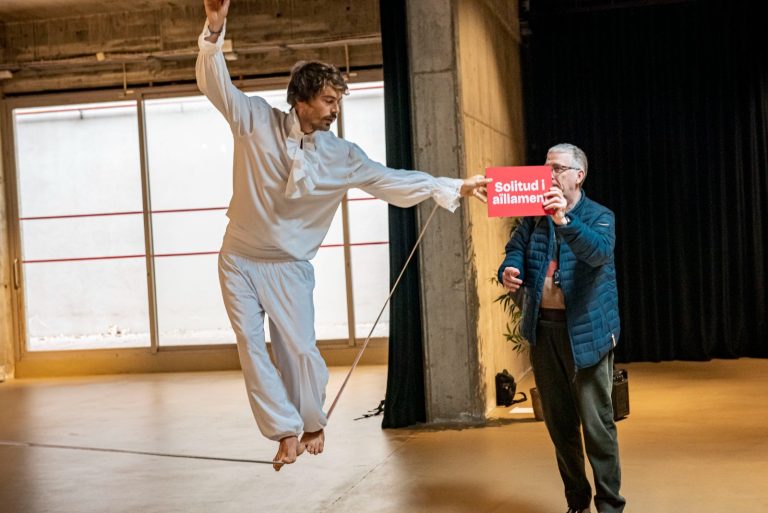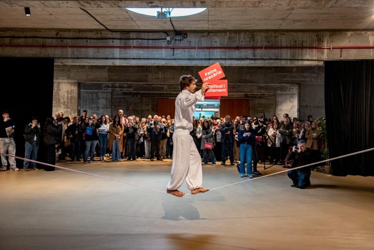 Per il·lustrar aquesta societat a la corda fluixa, Càritas ha dut a terme una acció visual. El funambulista Aleix Hernando ha estat l’encarregat de passar per una corda, representant els equilibris que ha de fer una part important de la ciutadania per arribar a final de mes. Tot travessant la corda, el funambulista ha anat carregant diferents problemàtiques, com la feina precària, les despeses d’habitatge, els problemes de salut o la manca de xarxa social. Aquesta acumulació de factors ha provocat un augment de la inestabilitat, i finalment la persona ha acabat caient. D’aquesta manera, Càritas ha volgut denunciar la gran precarietat que pateix un gruix de la societat, tot indicant que totes les persones que acull i acompanya han de creuar aquesta corda diàriament.